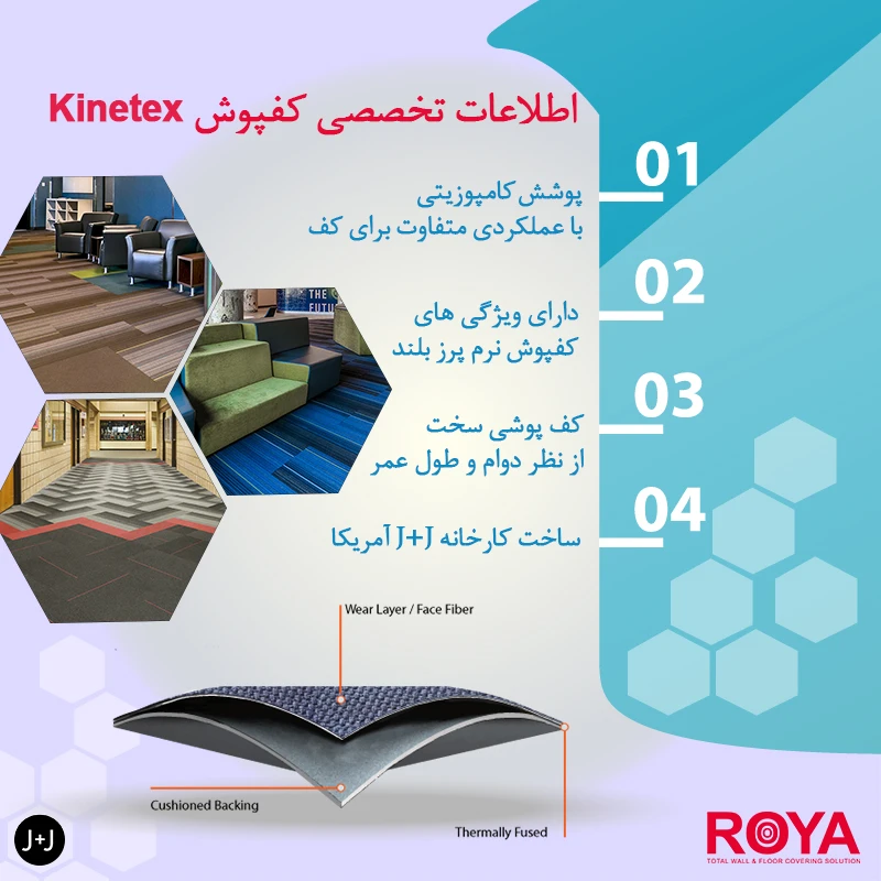 کاینتکس پوشش کامپوزیتی با عملکردی متفاوت برای کف کفپوش کامپوزیتی کاینتکس تامین و اجرا | شرکت رویا طرح داخلی ⁣ ⁣ www.royaco.com ⁣ ✅ این پوشش کامپوزیتی حاصل دانش فنی روز، نوآوری و تجربه برای ارائه راه حلی متمایز در راستای رفع نگرانی های مصرف کننده در مقایسه با سایر پوشش های کف توسط شرکت رویا طرح داخلی به بازار ارائه شده است. ⁣✅ Kinetex® یک کفپوش کامپوزیت نساجی پیشرفته است که هم مشخصات اصلی یک کفپوش نرم پرز بلند را دارد و هم کارایی و مشخصات یک کفپوش سخت از نظر دوام و طول مفید عمر و کیفیت را دارا می باشد. یک کفپوش منحصر بفرد که به جای کفپوش های سطوح سخت پیشنهاد می گردد. ⁣✅ کفپوش ⁣Kinetex توسط متخصص ترین تولید کننده ی موکت و کفپوش های PVC فضاهای پرتردد در شرکت J+J آمریکا تولید شده است. ✅ کاینتکس های کارخانه J+J شامل گروه بی همتایی از محصولات مورد نیاز جهت محیط های کوچک، مراکز درمانی، تحصیلی و اداری می باشد که علاوه بر اینکه مطابق استانداردهای انسانی و با کارآمدی بالا می باشد، نسبت به سایر کفپوش های با سطوح سخت تجاری مشابه، اثرات مخرب زیست محیطی را ندارد. ⁣✅ کلید اصلی کارایی بالای کف پوش کاینتکس در ساختمان و لایه های آن می باشد. به طوری که لایه ها وقتی با هم استفاده می شوند یک سطح نرم همه کاره و سبک می سازد که از لحاظ کیفیت همانند سطوح سخت می باشد.