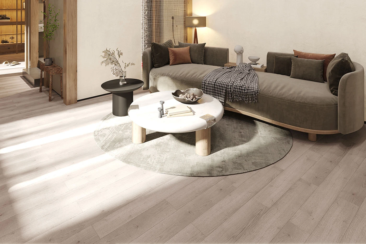 - کفپوش لمینت سفید مات و استخوانی: این کفپوشها دارای سطحی مات هستند که انعکاس نور را کمتر میکند. این ویژگی باعث میشود که اتاقها آرامتر و دنجتر به نظر برسند.