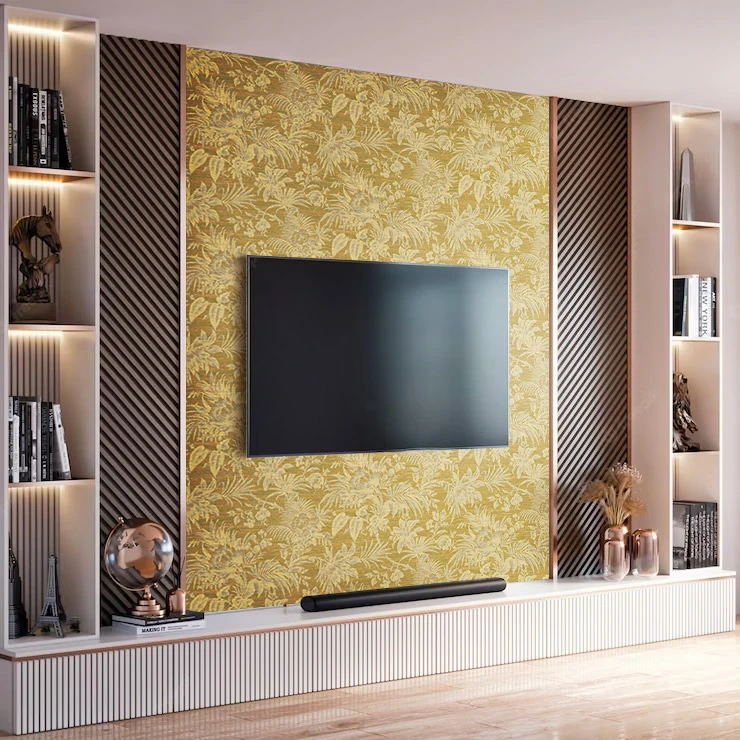 • کاغذدیواری با الگوی ساده و منظم: استفاده از الگوی ساده و منظم مانند خطوط عمودی یا افقی بر روی کاغذدیواری پشت تلویزیون، به دیزاین جدی و حرفه‌ای تری می‌انجامد.