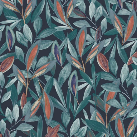 با استفاده از تکنیک خاص چاپ و رنگ، برگهای بزرگ گیاه فیلودندرون به طرز شگفت انگیزی واقعی به نظر میرسد. برجسته بودن برگها روی کاغذ وینیل، با رنگهای طلایی و نقرهای نشان داده شده است.